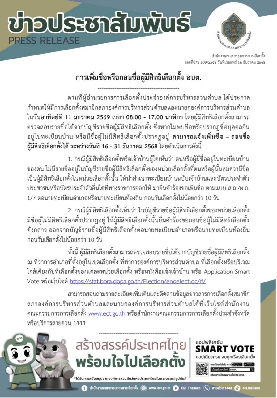 สามารถแจ้งเพิ่มชื่อ - ถอนชื่อ ผู้มีสิทธิเลือกตั้งได้ ระหว่างวันที่ 16 - 31 ธันวาคม 2568